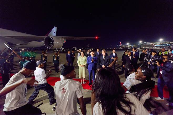 | ▲ 주요 20개국(G20) 정상회의에 참석하는 이재명 대통령과 김혜경 여사가 21일(현지시간) 남아프리카공화국 요하네스버그 OR탐보국제공항에 도착한 공군 1호기에서 내려 환영공연을 관람하고 있다. |