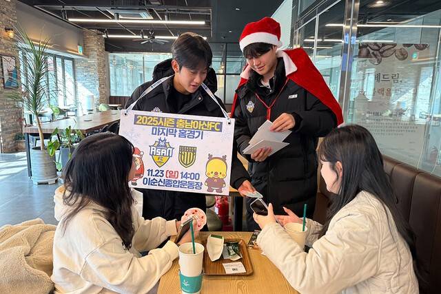 '선수가 산타-루돌프 복장으로 직접 PR'... 충남아산 손준호-한교원, 아산 대학가 깜짝 방문해 홈 폐막전 일일 홍보