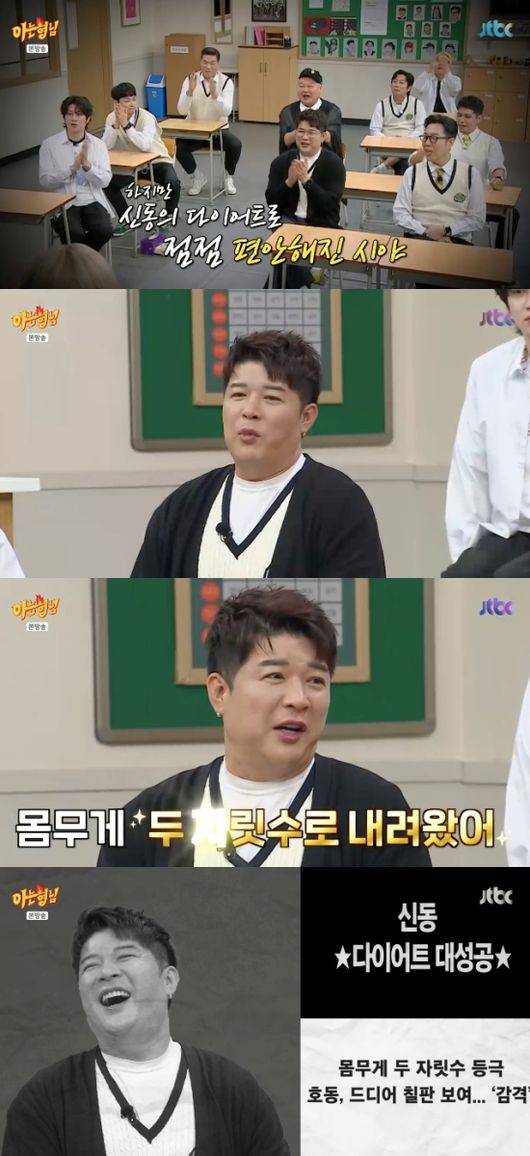 이날 강호동은 신동의 몸이 급 날씬해졌다고 칭찬했다. 강호동은 ‘아형’ 촬영 시, 자신의 앞자리에 거구였던 신동이 앉기 때문에 한 번씩 답답함을 느껴왔다고 고백했다.