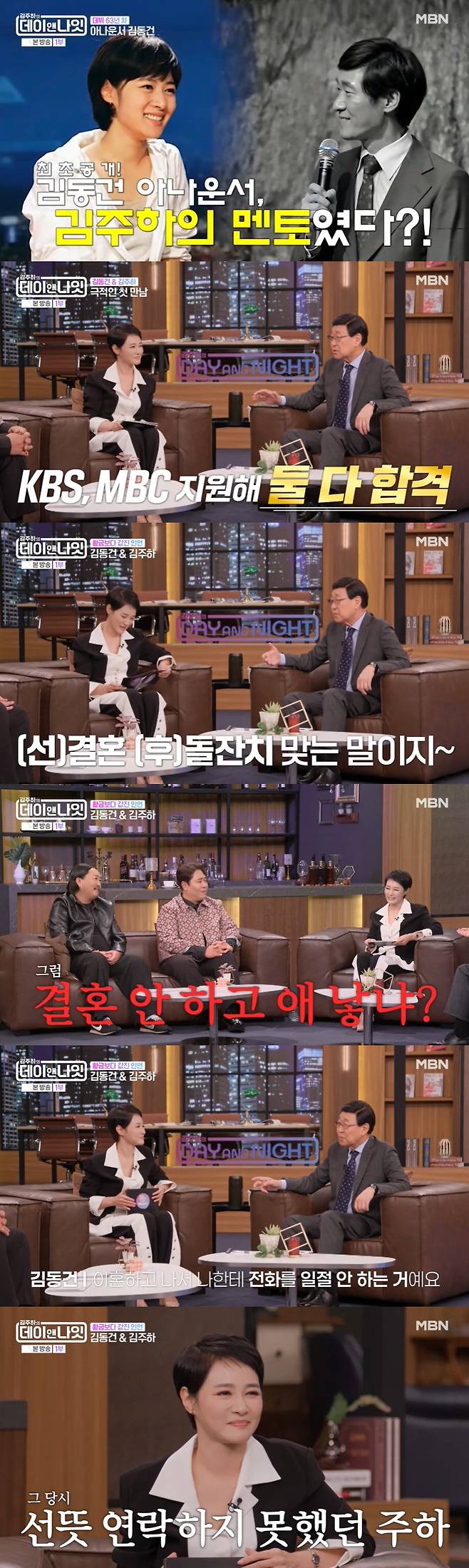 김동건은 자신을 멘토라고 부르는 김주하에게 "제 말에 용기를 얻어 열심히 아나운서 시험을 준비해 KBS, MBC 시험에 모두 합격했다. 제가 MBC를 추천해서 MBC 아나운서가 됐고, 이후 MBN의 메인 뉴스도 맡았다. 제가 잘 보기도 했지만 본인도 소질을 가지고 있었다. 어딜 가나 방송을 잘했다"라며 흡족해했다.