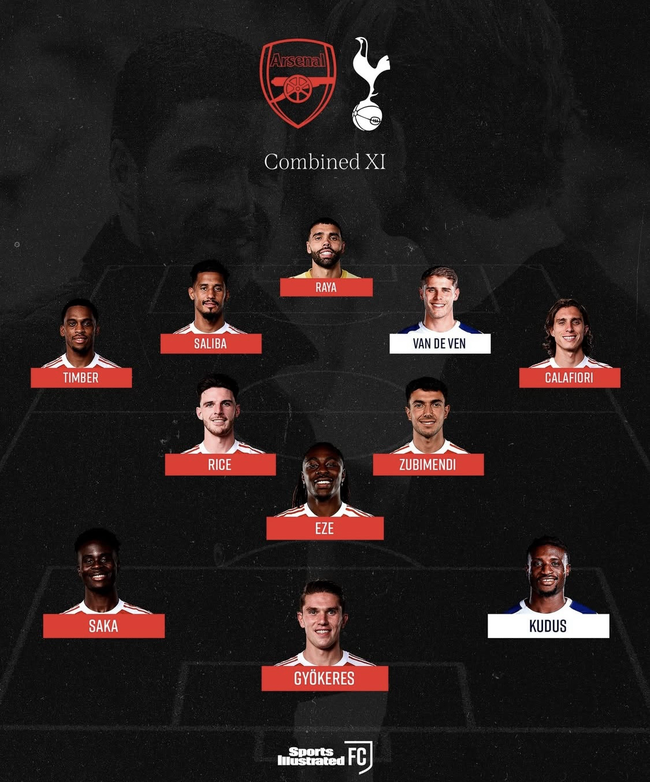 경기를 앞두고 미국 ‘스포츠 일러스트레이트’가 공개한 통합 베스트11 결과는 충격적이었다. 4-3-3 포메이션에서 토트넘 선수는 단 두 명 뿐이었다. 아스널에서는 빅토르 요케레스, 부카요 사카, 에베레치 에제, 마르틴 수비멘디, 데클란 라이스, 리카르도 칼라피오리, 윌리엄 살리바, 율리안 팀버, 다비드 라야 등 9명이 이름을 올렸다. 토트넘은 모하메드 쿠두스, 미키 반 더 벤 뿐이었다.