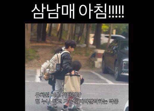 아직도 남매는 예쁜 막둥이를 지키기 위해 매일 손을 붙잡고 등·하원을 하고 있는데, 유치원 차를 기다리면서 뽀뽀 전쟁은 여전하다고 합니다. 보고만 있어도 절로 미소가 지어지는 모습이죠.