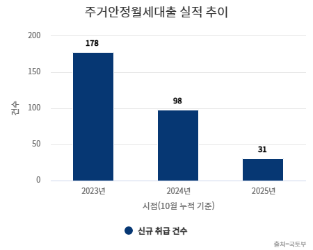 23일 헤럴드경제가 국토교통부를 통해 주택도시기금의 ‘주거안정월세대출’ 실적을 받아 분석한 결과 올해 10월까지 누적 신규 취급 건수는 31건이었다. 지난해 같은 기간(98건)과 비교하면 1년 새 68.4%가량 줄어든 수준이다. 2년 전(178건)과 비교하면 82.6%가량 줄었다.