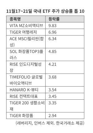 23일 한국거래소에 따르면 지난 17일부터 21일까지 국내 ETF 시장에서 가장 높은 수익률을 기록한 종목은 ‘VITA MZ소비액티브’로 9.83% 급등했다. 이어 ‘TIGER 여행레저’가 6.96%, ‘ACE MSCI필리핀(합성)’이 6.34% 상승하며 소비재 및 신흥시장 관련 ETF가 상위권을 석권했다. 레버리지 및 인버스 종목을 제외한 기준이다.