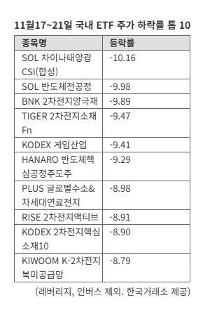 반도체 ETF도 큰 폭의 조정을 받았다. ‘SOL 반도체전공정’이 -9.98%, ‘HANARO 반도체핵심공정주도주’가 -9.29% 하락하며 기술주 전반의 차익실현 매물 출회가 이어졌다. 다만 증권가는 반도체 ETF 조정이 단기 차익실현 성격이 강하다고 봤다. 삼성증권 양일우 연구원은 “반도체 업종 12개월 예상 이익뿐만 아니라 올 4·4분기 이익 전망치도 상향조정되고 있다는 점이 주목할 만하다”며 “인공지능(AI) 버블 우려 등에도 글로벌 금융시장 자금 유입이 원활하고, 반도체 수출 단가도 전월 대비 강세 추세를 지속하고 있다”고 분석했다.
