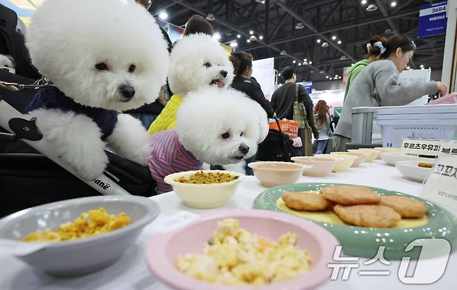 (고양=뉴스1) 장수영 기자 = 23일 경기 고양시 킨텍스에서 진행중인 '2025 메가주 일산'을 찾은 반려견들이 간식을 바라보고 있다. 2025.11.23/뉴스1