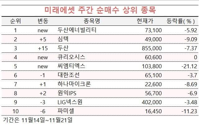 엔비디아 등에 AI 가속기용 동박적층판(CCL)을 공급하는 두산은 순매수 3위였다. 두산은 이달 초 종가 기준 100만원을 넘겨 '황제주(주가 100만원 이상 종목)'로 올라섰지만 최근 증시 약세에 지난 21일 종가 85만5000원까지 내렸다. 투자 고수들은 이 기업의 전자소재사업(전자BG)이 AI 메모리 반도체 업황 수혜를 볼 것이라고 본 분위기다. 양승수 메리츠증권 연구원은 “CCL 시장은 거대한 전방 수요를 바탕으로 공급자 우위 국면으로 진입할 전망”이라고 내다봤다.
