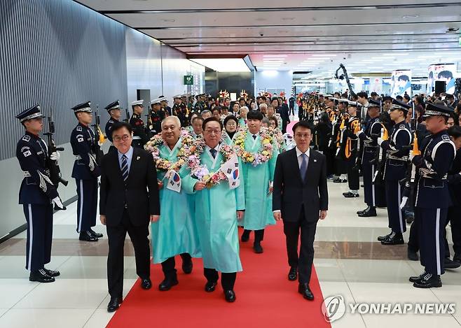 (서울=연합뉴스) 홍해인 기자 = 김민석 국무총리와 우원식 국회의장이 23일 서울 강서구 김포공항 국제선 청사 입국장에서 열린 '대한민국임시정부 요인 환국 재현' 행사에서 임시정부 요인 후손과 도열한 의장대를 사열하고 있다. 2025.11.23