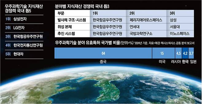매일경제는 23일 글로벌 특허 분석 기업 렉시스넥시스와 공동으로 ‘우주 과학기술 분야 국내 기업·기관별 지식재산 경쟁력’ 보고서를 발표했다. 글로벌 우주경제 규모가 2040년 2조달러(약2866조원)에 이를 것으로 전망되면서, 전세계 정부와 기업은 이 분야 IP 확보에 공을 들이고 있다.