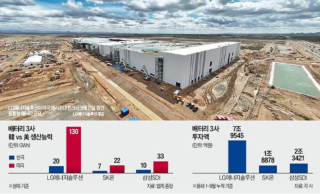 문제는 배터리 3사 모두 미국에 공장을 짓는 데서 나온다. LG에너지솔루션은 올 1~9월 미시간과 애리조나 등지에 공장을 짓는 데 7조9545억원을 투자했다. 인디애나에 공장을 건설하고 있는 삼성SDI는 같은 기간 2조3421억원을 투자했고 SK온은 테네시와 조지아 등지에 1조8878억원의 설비투자를 했다. 대다수 투자금은 미국에서 배터리를 판매해 거둬들인 달러로 충당하지만 부족한 자금은 ‘달러 빚’으로 댄다. 환율이 10% 뛰면 배터리 3사의 올해 원화 환산 투자금이 1조원 이상 늘어나는 셈이다.