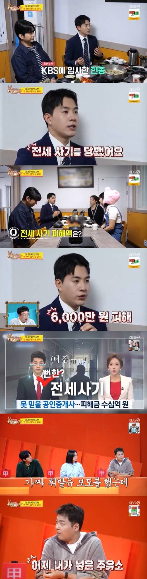 선배 엄지인 아나운서는 "전세 사기 당하고 다음날 출근해서 뉴스할 때, '창원 오피스텔에서 전세 사기가 일어났다'며 자기 얘기를 직접 뉴스에서 보도했다"고 말해 놀라움을 자아냈다. 이에 전현무도 "나도 그런 적 있다. 뉴스 하는데 '가짜 휘발유' 소식을 보도하는데 내가 어제 넣은 곳이었다. 깜짝 놀랐다. 아나운서가 헛똑똑이들이 많다"고 설명했다.
