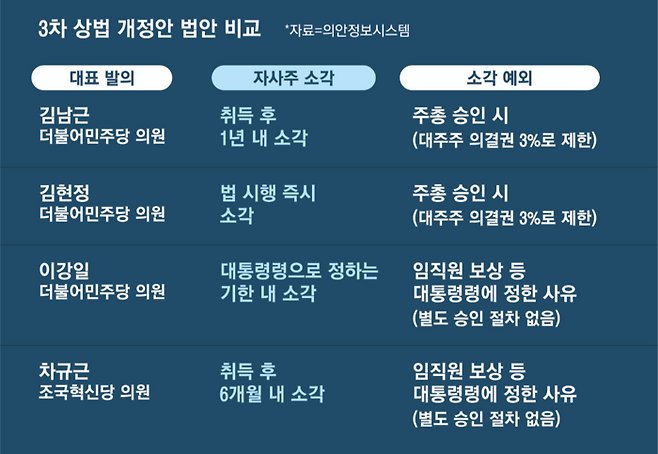 민주당 코스피5000특위를 이끌고 있는 김남근·김현정 의원의 발의한 상법 개정안에는 주총의 승인을 자사주 의무 소각 예외 절차로 두고, 이때 대주주의 의결권을 발행 주식 총수의 3%로 제한하도록 하고 있다. 다만 최종안에 대주주 의결권 제한이 포함될지는 미지수다.