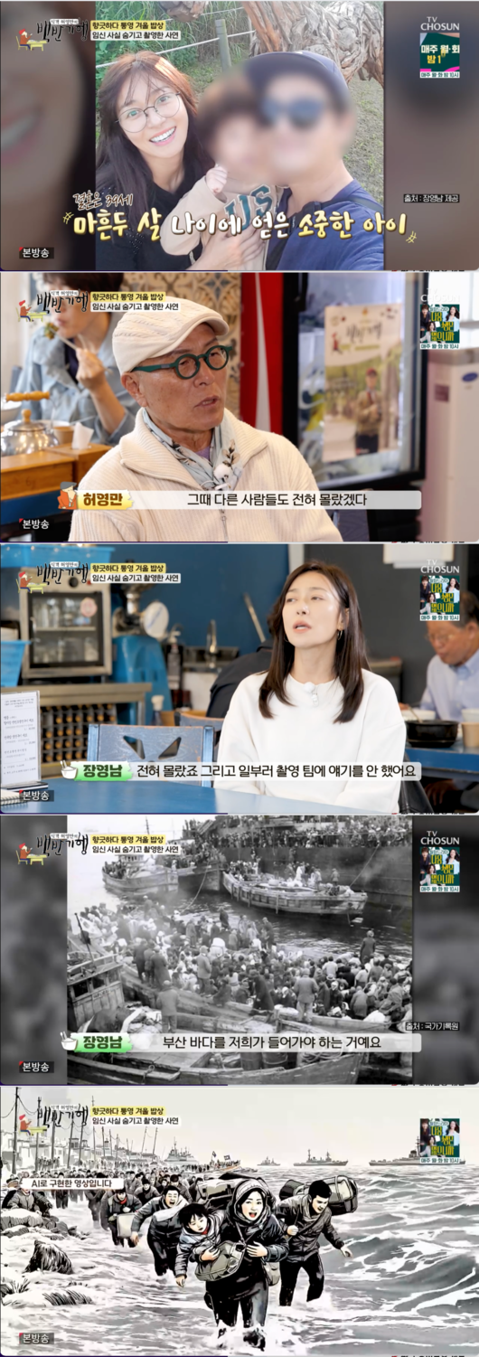 장영남은 "씬 중에 바다를 들어가 애를 업고 바다를 달려서 쪽배를 올라타야 하는 장면이 있었다"며, 임신한 몸으로 차가운 바닷물에 뛰어들어 액션 연기를 감행했음을 밝혔다.
