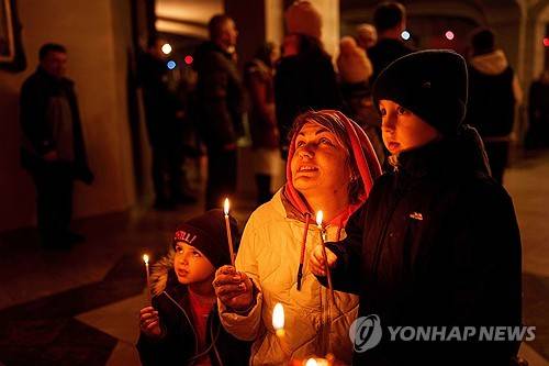 A mother with her children pray during service at the Holy Apostle Andrew church in Bucha, Ukraine, on Sunday, Nov. 23, 2025. (AP Photo/Evgeniy Maloletka)