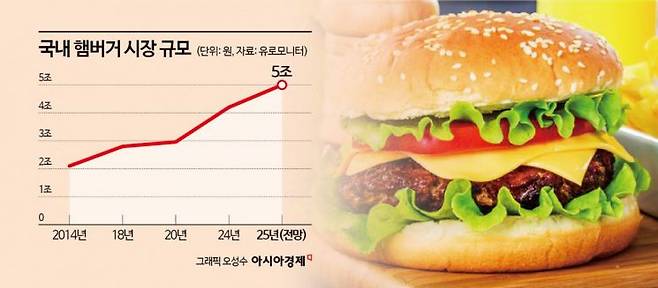 24일 글로벌 시장조사업체 유로모니터에 따르면 국내 햄버거 시장은 2014년 2조1000억원에서 2024년 4조2000억원으로 10년 사이 두 배 가까이 성장했다. 올해는 5조원 돌파가 유력하다. 롯데리아, 버거킹, 맥도날드, 맘스터치 등 주요 브랜드들은 가격 경쟁력을 유지하는 동시에 수제버거·프리미엄 치즈·지역 특산물 등을 활용한 신메뉴로 '외식 대체재' 전략을 강화하고 있다.