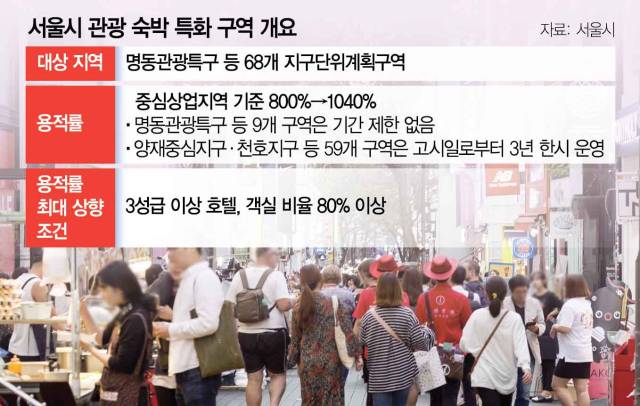 서울시가 외국인 관광객 증가에 대응해 명동, 테헤란로, 여의도 등 68개 지역을 ‘관광숙박 특화 구역’으로 지정해 3성급 이상 호텔을 지으면 용적률을 기존의 1.3배 늘어난 1040%까지 상향을 허용한다.