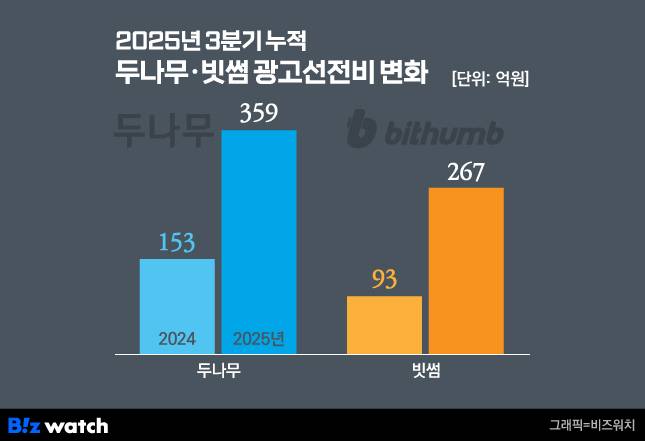 두나무가 마케팅비용을 대폭 늘린 데는 가상자산 시장의 호황과 더불어 빗썸의 '맹추격'을 의식했기 때문으로 보인다. 빗썸은 다니엘 헤니에 이어 배우 정우성, 전종서를 모델로 발탁하면서 인지도를 늘리는데 주력했다. 3분기 누적 광고선전비는 267억원으로 전년(93억원) 대비 3배 가까이 늘었다. 신규 가입자 유치 프로모션을 적극 펼치면서 판매촉진비 또한 880억원에서 1726억원으로 껑충 뛰었다.