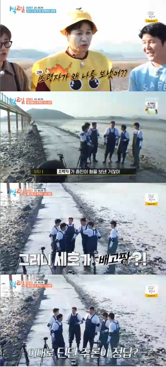 주종현PD는 5명이 놋다리 자세로 길 만들고 마너지 멤버 1명이 땅에 닿지 않은 상태로 갯벌 위 장애물들을 거쳐서 돌아와야 한다고 설명했다.