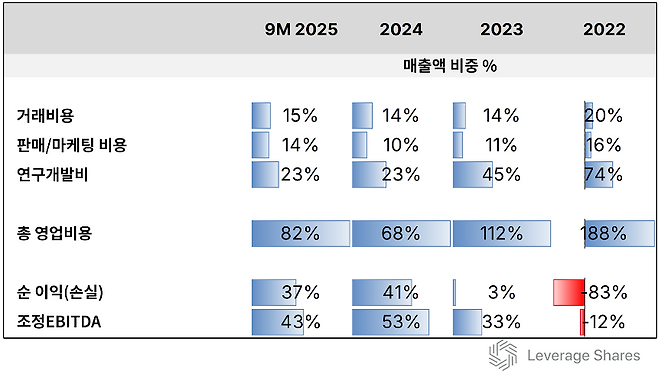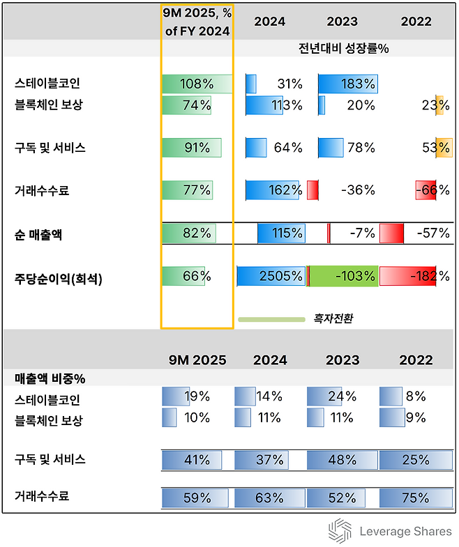 매출 구성 측면에서는 스테이블코인이 가장 큰 성장 동력으로 작용했다. 거래 기반 수익은 전년과 비슷한 수준이었으며, 스테이블코인·스테이킹·신탁 서비스 및 구독 기반 거래 상품 등 비거래 부문에서 강한 성장세를 나타냈다. 스테이블코인 사업의 확장은 기관투자자들에게 코인베이스의 매력을 강화시키는 역할을 했다. 이와 함께 코인베이스는 해외 거래소에서의 유동성 공급자에 대한 수수료 리베이트와 커미션 지급액이 289%나 늘었다. 다만, 전체적인 비용 대비 수익 구조는 최근 몇 분기 동안 안정적인 편이다.