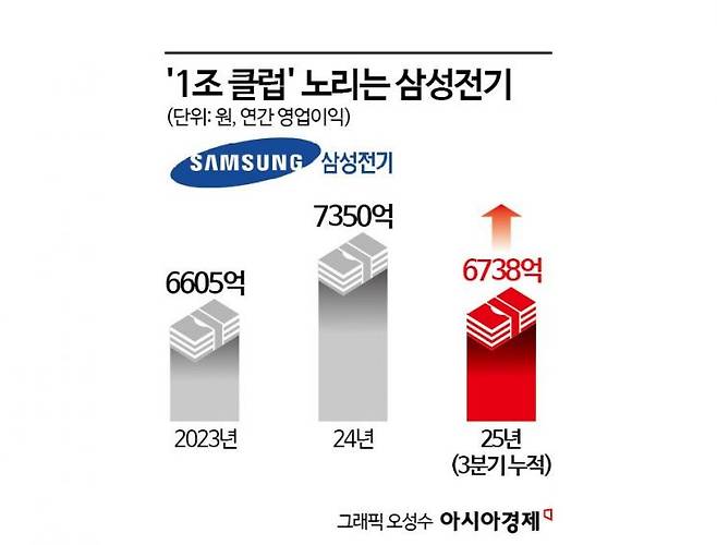 삼성전기는 3년 만에 '1조 클럽' 복귀를 노리고 있다. 2022년 1조4869억원에 달하는 영업이익을 냈지만 이후 6000억~7000억원대로 내려앉았다. 지난해 처음으로 연간 매출 10조원을 돌파한 데 이어 올해 3분기 누적 영업이익 6738억원을 기록했다. 1분기 2005억원, 2분기 2130억원, 3분기 2603억원 순으로 최대 20%대 성장세를 나타내고 있어 연간 1조원대 진입이 기대된다.