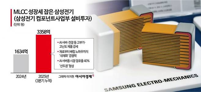 전체 시장 점유율은 일본 무라타 40%·삼성전기 25% 수준으로 형성돼 있지만, AI 서버 등 핵심 시장에선 삼성전기가 업계 1위를 다툰다. 업계 관계자는 "소재·공정 기술 경쟁력을 바탕으로 초소형·초고용량·고온·고압 등을 보증하는 AI 서버용 라인업을 확대 중"이라며 "AI 서버용 시장에선 약 40% 점유율을 확보해 글로벌 선두권을 형성하고 있다"고 말했다.