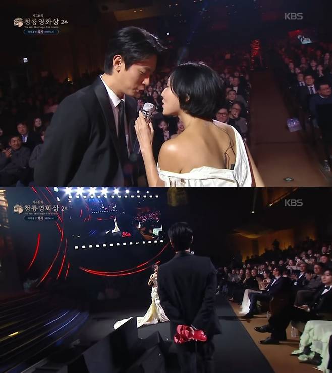 무덤덤하게 화사의 공연을 먼 발치에서 지켜보던 박정민 또한 그녀를 향해 가벼운 춤사위로 화답했고 행사장을 가득 채운 동료 배우들은 이를 흐뭇하게 지켜봤다.