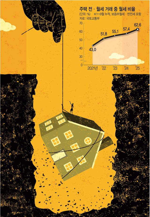 24일 국토교통부에 따르면 올 들어 9월까지 누적 월세 거래량 비중은 62.6%로 전년 동기 대비 5.2%포인트 늘면서 조사 이래 최고치를 기록했다. 최근 임대차시장에서 월세가 주된 거래 유형으로 고착화되고 있다는 평가가 나온다. 고강도 규제로 갭투자가 막히자 월세 중심 계약이 급증하고, 저금리에 월세를 선호하는 집주인이 늘어난 추세와 맞물린 결과다.