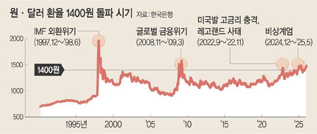 24일 불붙은 원·달러 환율을 진화하기 위한 국민연금 ‘소방수’ 등판까지 검토되는 것은 최근 환율 급등세가 1997년 IMF 외환위기·2008년 글로벌 금융위기를 연상시킬 만큼 심각한 수준에 이르렀기 때문이다. 고환율이 한국 경제 ‘뉴노멀’로 자리 잡고 있다는 분석까지 나온다.