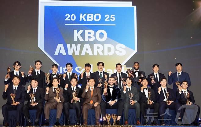 (서울=뉴스1) 김진환 기자 = 24일 오후 서울 송파구 잠실 롯데월드 호텔에서 열린 프로야구 '2025 신한 SOL 뱅크 KBO리그' 시상식에서 수상자들이 기념 촬영을 하고 있다.