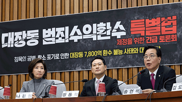 국민의힘은 검찰의 대장동 사건 항소 포기와 관련해 “대장동 게이트가 정권의 비호 아래 국가공인 범죄로 둔갑하는 참담한 현실을 목도하고 있다”며 ‘대장동 범죄수익 환수 특별법’을 당론 추진하겠다고 밝혔습니다.