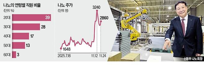 경상대 교수이던 신 회장은 외환위기 여파가 한창인 1999년 제자들 일자리를 직접 만들겠다는 각오로 대학 실험실에서 나노를 창업했다. 당시 창업에 동참한 제자 6명 모두가 지금까지 나노에서 임원으로 일하고 있다. 나노는 내년엔 모든 직원 급여를 중견기업 수준으로 인상하고, 금요일 오전까지 근무하는 주 4.5일제를 실행할 계획이다.