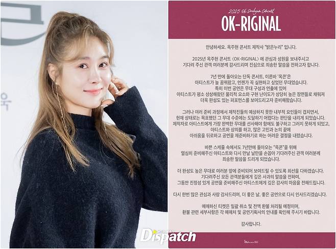 가수 옥주현은 다음 달 6~7일 KBS아레나에서 단독 콘서트 '오케이-리지널'(OK-RIGINAL)을 열 예정이었다. 7년 만의 단독 콘서트다.