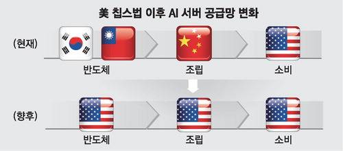 이렇게 되면 한국과 대만의 파운드리에서 생산된 반도체가 중국으로 수출돼 전자제품으로 조립된 후 미국으로 수출되는 것이 아니라 미국에서 웨이퍼부터 반도체를 거쳐 서버까지 공급망이 미국에 완전히 구축되는 것이다.