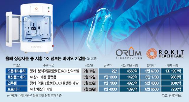 로킷헬스케어는 인공지능(AI) 장기 재생 플랫폼 기업으로 올 5월 코스닥 기술특례로 상장했다. 공모가 1만 1000원으로 상장 첫날 시총이 1426억 원에 불과했던 점을 고려하면 6개월 만에 7배 이상 급등한 셈이다. 오름테라퓨틱은 올 2월 상장해 9개월 만인 이달 초 시총 1조 원을 넘어섰다. 이외에도 올해 상장한 인투셀(287840), 프로티나(468530) 등도 1조 클럽 입성을 앞두고 있다.