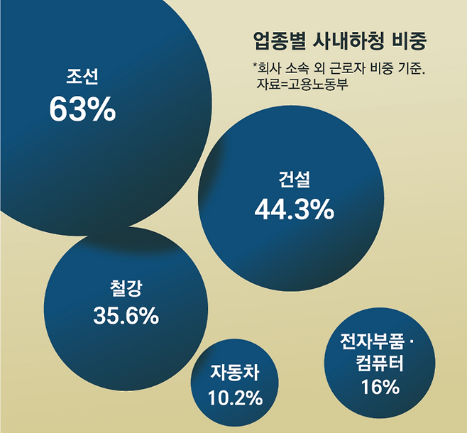 가령 국내 최대 완성차 업체인 현대자동차는 사내외 협력사가 8500여 곳, 대표 조선 업체인 HD현대는 3900곳에 달한다. 건설업도 원·하청 구조가 복잡하다. 원도급사(종합건설사)가 전체 공사를 수주하고 토목·건축·전기 등 공종별 전문 건설사에 하도급을 주는 ‘3단 구조’가 기본인데 현장당 수십~수백 개 협력업체가 참여하는 경우가 대부분이다.