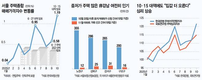 정부가 이런 논란을 감수해가며 규제를 강화했는데도 좀처럼 집값은 잡힐 줄 모른다. 전문가들은 이번 대책이 단기 수요 억제만 성공했을 뿐, 장기적으로 집값을 안정시키기에는 한계가 있다고 지적했다. 특히 강력한 대출 규제로 실수요자 주거 불안이 커진 만큼, 향후 규제 완화와 보완 정책이 필요하다는 지적이 나왔다. 양지영 신한 프리미어 패스파인더 전문위원은 “10·15 대책을 발표했지만 시행 세부 방안이 불명확하고 향후 주택 공급 일정도 불확실한 탓에 지난 한 달간 수요자가 매수 판단을 하지 못하는 상황이 이어졌다”고 분석했다. 그러면서 “주택 공급이 계속 부족할 것이란 불안감을 잠재우지 못하면 내년 봄 이사철부터는 매수세가 다시 살아날 수 있다”고 관측했다.