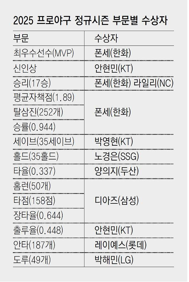 4관왕에 MVP까지 트로피 다섯 개를 품고도 아쉬움을 숨기지 못한 것도 같은 맥락이다. 폰세는 “개인상도 좋지만 팀 우승이 더 좋다. 한국에 오면서 한국시리즈 우승이 궁극적인 목표였는데 박해민(35·LG)이 우리의 우승을 저지했다”며 웃었다. 도루상(49개)과 중견수 부문 수비상 수상자로 시상식에 참석한 박해민은 폰세에게 “빨리 (미국으로) 돌아가라”고 응수했다.