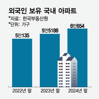 한국부동산원 통계에 따르면 외국인 보유 아파트는 2022년 말 5만135가구에서 2023년 말 5만5188가구, 2024년 말 6만654가구로 매년 증가세를 보이고 있다. 국토교통부 외국인 주택소유통계 주요 현황에 따르면 지난해 말 기준 외국인 보유주택 중 약 56%가 중국인 소유로 집계됐다.