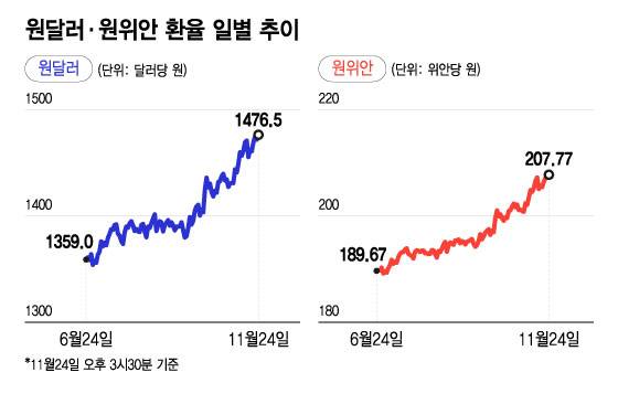 24일 원달러 환율은 장중 1476.5원으로 올해 최고 수준을 기록했다. 지난 6월24일 1359원이었던 것과 비교하면 5개월 만에 8.65% 오른 것이다. 중국 위안화는 상승폭이 더 크다. 같은 기간 원위안 환율은 189.67원에서 207.77원으로 9.54% 올랐다. KB부동산에 따르면 서울 아파트 매매가격은 지난 6월 대비 5개월 간 6.02% 올라 환율 상승폭에 못미쳤다. 서울 아파트는 11월 전월 대비 1.72% 올라 2020년 9월(2.00%) 이후 5년 2개월 만에 최고 상승률을 기록했다.