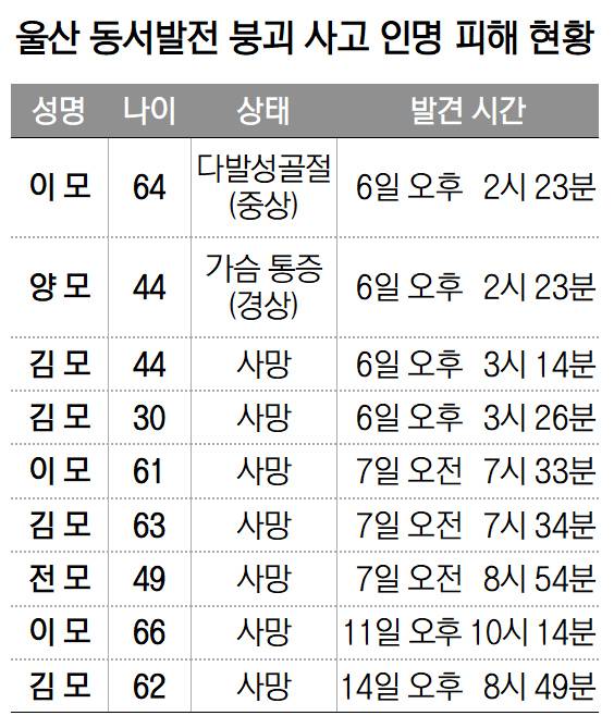 앞서 지난 6일 한국동서발전 울산화력발전소에서는 가로 25m, 세로 15.5m, 높이 63m 규모의 보일러 타워 5호기가 철거 작업 중 붕괴했다. 이 사고로 현장 작업자 9명 중 7명이 숨졌고, 이 씨 등 2명은 중경상을 입고 가까스로 구조돼 치료받고 있다.
