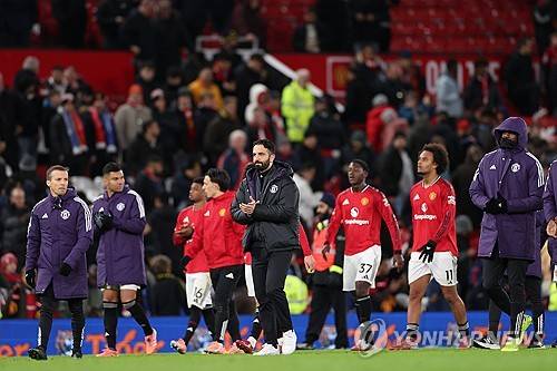 epa12546758 Manchester United manager Ruben Amorim (C) and players of Manchester United react after the English Premier League match between Manchester United and Everton FC in Manchester, Britain, 24 November 2025. EPA/ADAM VAUGHAN EDITORIAL USE ONLY. No use with unauthorized audio, video, data, fixture lists, club/league logos, 'live' services or NFTs. Online in-match use limited to 120 images, no video emulation. No use in betting, games or single club/league/player publications.