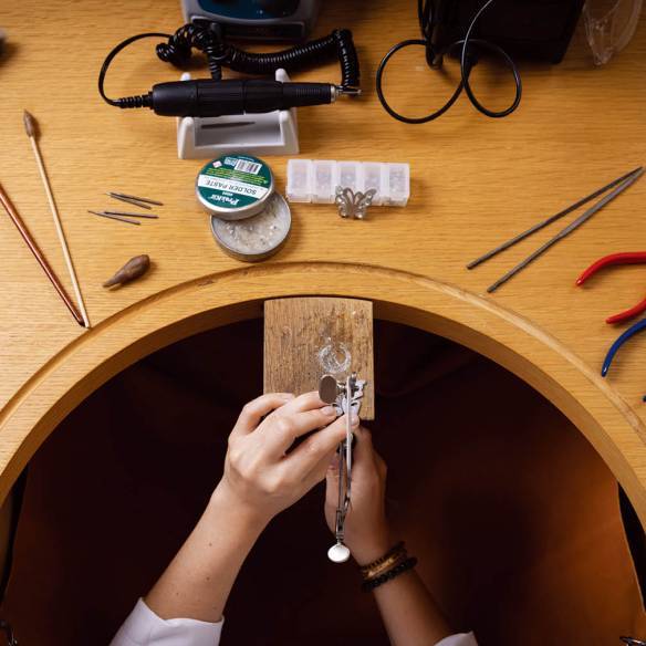 건너편 워크숍 룸에서는 다른 수업이 한창이었다. 수강생들이 뭔가를 자르고 접합하느라 분주했다. 공방의 한 장면 같았는데 목업(Mock-up) 클래스였다. 얇은 주석을 나비 모양으로 잘라내고 작은 펜치로 날개 곡선을 만든 뒤 라인스톤으로 장식하는 작업이 이뤄졌다. 요컨대 레꼴 주얼리 스쿨에서는 주얼리 밑그림을 그리고, 맞은편에서는 귀하고 가치 있는 소재를 직접 체험하는가 하면 동시에 3차원 모형을 만든다. 보석학을 머리가 아니라 체험으로 이해하는 방식. 레꼴 주얼리 스쿨이 강조하는 교육 철학의 전형이다.