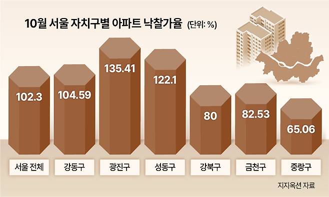 25일 경·공매 데이터업체 지지옥션에 따르면 지난달 서울 25개 자치구 중 아파트 평균 낙찰가율이 100%를 넘긴 지역은 강동·광진·성동·영등포·용산·동작·서초·송파구 등 8곳으로 집계됐다. 서울 전체 낙찰가율은 102.3%로 2022년 6월(110.0%) 이후 3년 4개월 만의 최고치를 기록했다.