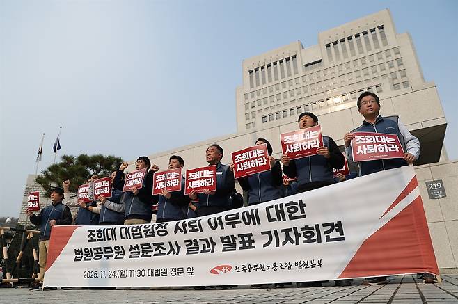전국공무원노동조합 법원본부는 24일 '조희대 대법원장 사퇴 여부에 대한 법원공무원 설문조사 결과 발표 기자회견'을 열고 이같이 밝혔다.