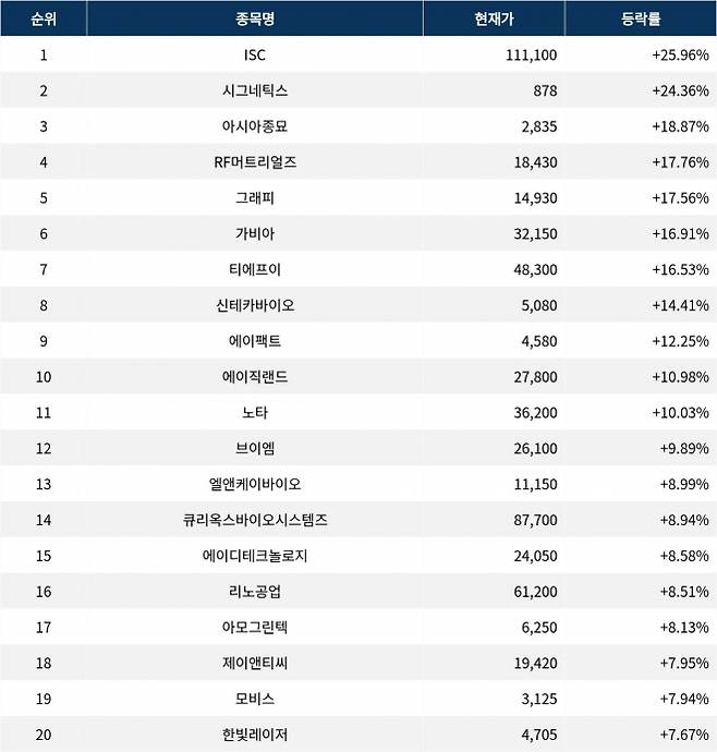 6위 가비아(079940)는 현재가 32,150원으로 16.91% 상승 중이다. 7위 티에프이(425420)는 현재가 48,300원으로 16.53% 상승 중이다. 8위 신테카바이오(226330)는 현재가 5,080원으로 14.41% 상승 중이다. 9위 에이팩트(200470)는 현재가 4,580원으로 12.25% 상승 중이다. 10위 에이직랜드(445090)는 현재가 27,800원으로 10.98% 상승 중이다.