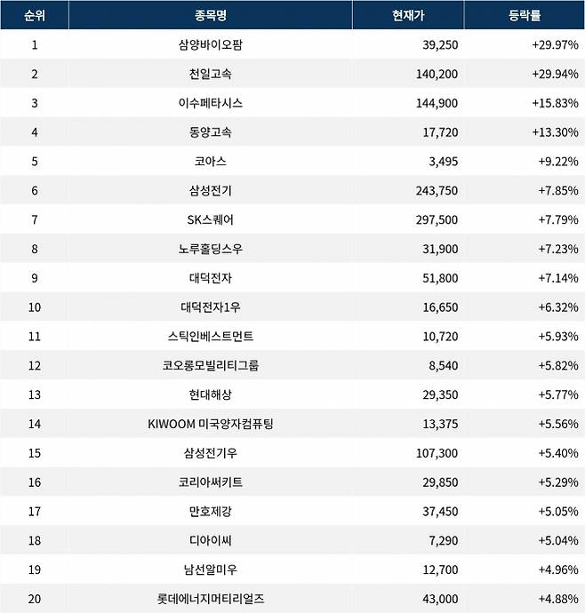 6위 삼성전기(009150)는 현재가 243,750원으로 7.85% 상승 중이다. 7위 SK스퀘어(402340)는 현재가 297,500원으로 7.79% 상승 중이다. 8위 노루홀딩스우(000325)는 현재가 31,900원으로 7.23% 상승 중이다. 9위 대덕전자(353200)는 현재가 51,800원으로 7.14% 상승 중이다. 10위 대덕전자1우(35320K)는 현재가 16,650원으로 6.32% 상승 중이다.