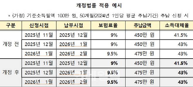 이를 해소하기 위해 관련법을 개정해 추납보험료 산정을 위한 보험료율 적용 기준월을 기존 ‘신청한 날이 속하는 달’에서 ‘납부기한이 속하는 달’로 변경한 것이다.