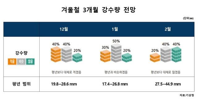 강수량은 12월에는 평년보다 대체로 적고, 1월은 평년과 비슷하며, 2월에는 다소 많을 것으로 예상된다.