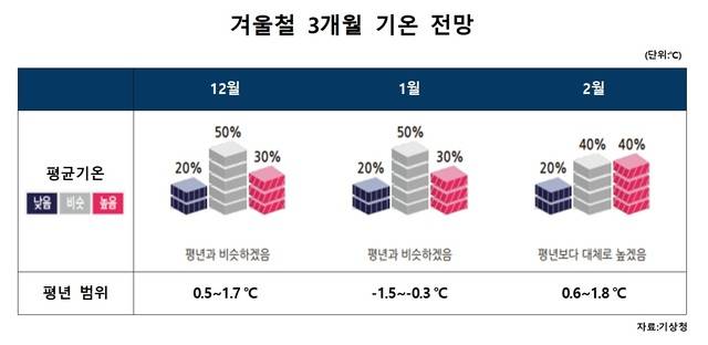 기상청은 12월 기온이 평년보다 낮을 가능성을 20%, 비슷할 가능성을 50%, 높을 가능성을 30%로 내다봤다. 내년 1월 역시 낮음·비슷·높음이 각각 20%, 50%, 30%였으며, 2월은 20%, 40%, 40%로 나타났다.