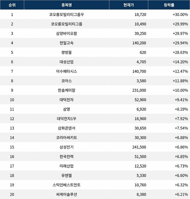 이어 상승률 2위 코오롱모빌리티그룹(450140)은 주가가 29.99% 폭등하며 종가 10,490원에 상승 마감했다. 상승률 3위 삼양바이오팜(0120G0)의 주가는 39,250원으로 29.97% 폭등하며 호조를 보였다. 상승률 4위 천일고속(000650)은 29.94% 상승하며 140,200원에 마감했다. 상승률 5위 쌍방울(102280)은 28.63%의 상승세를 타고 종가 620원에 마감했다.